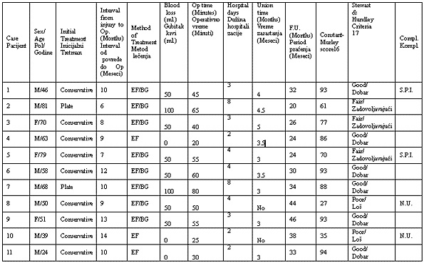 pacijenta. Funkcionalni rezultat Prema Constant i Murley skoru odličan funkcionalni rezultat postignut je kod šest (54,5%) pacijenata, dobar kod tri (27,3%) i loš kod dva (18,2%) pacijenta. Prosečan skor iznosio je 74,3 poena (27-94 poena). Prema kriterijumima Stewart i Hundley šest pacijenata (54,5%) tretiranih metodom spoljne fiksacije imali su dobar rezultat. Tri pacijenta (27,3%) su bili sa zadovoljavajućim rezultatom, kod kojih je postignuto dobro zarastanje ali funkcionalno smanjenje pokreta u laktu sa evidentnom radiografskom angulacijom većom od 10 stepeni. |