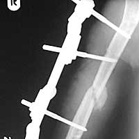![]() Slika 1. Mitković spoljašnji fiksator primenjen u lečenju nezaraslog preloma humerusa |