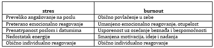 Tabela 1. Razlika između stresa i burnout